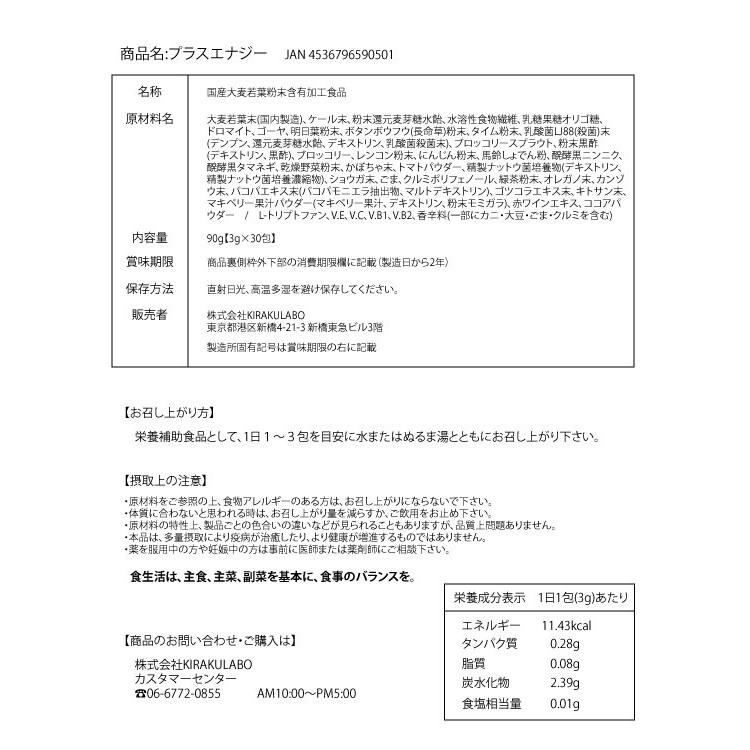 KIRAKU プラスエナジー KIRAKU プラスエナジー (peg001) 「気楽な暮らし」は身体の健康から 毎日の食事にプラス 8つの効果に有効とされる野菜類を配合。 国内GMP工場で国産野菜を中心に低温で粉末にした健康維持が目的の商品です。 ●内容量 : 1箱30包入り(粉末スティックタイプ) KIRAKU プラスエナジー 在庫状態 : 在庫有り ¥16,280(税込) 数量箱